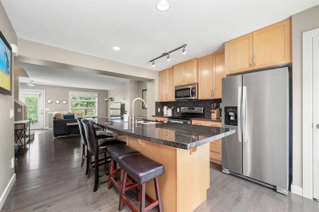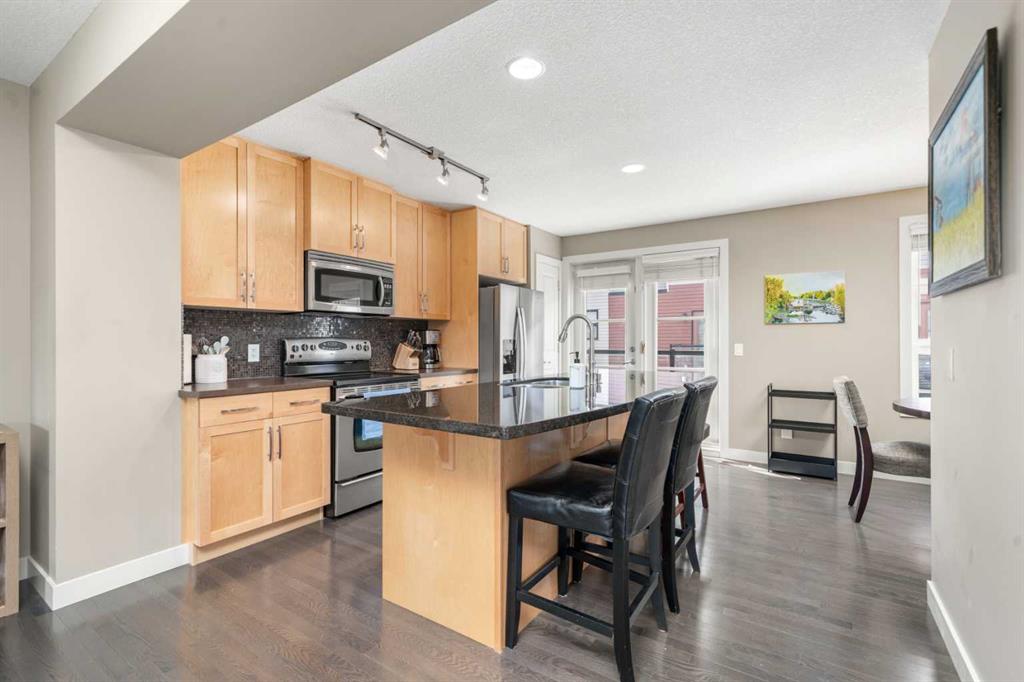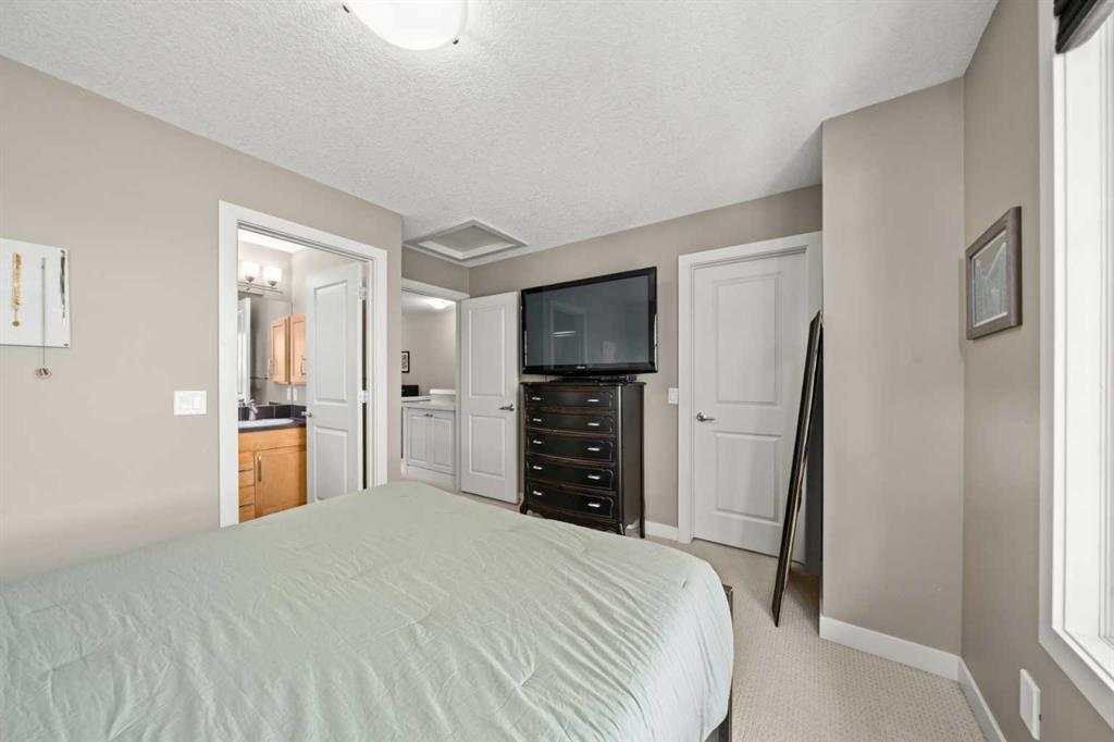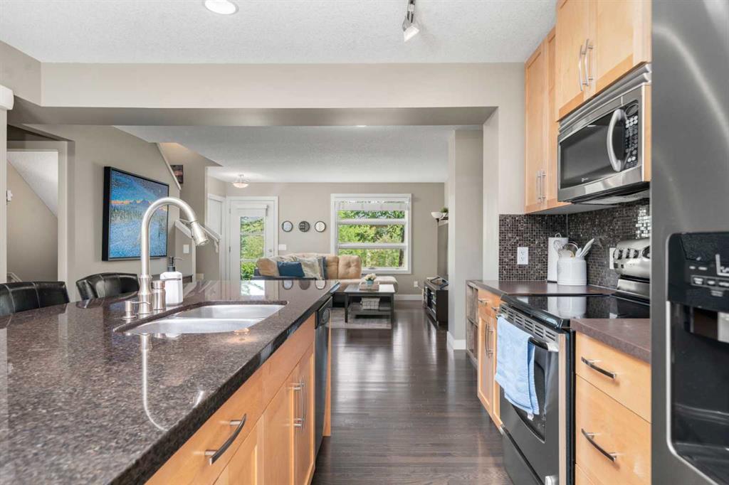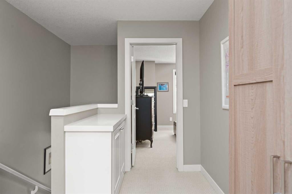 Set in the heart of ASPEN WOODS, this stylish townhome offers the perfect blend of comfort, convenience and low-maintenance living—ideal for professionals, roommates, or downsizers who value smart layout and lifestyle. With its FRONT PATIO overlooking a manicured courtyard, this home welcomes you with leafy green views and a peaceful front entrance. Inside, the OPEN MAIN FLOOR layout is warm and functional, anchored by a front living room with large windows that capture the morning sun. The PRIVATE BALCONY is located at the back of the home and accessed through the kitchen, offering a sunny spot for morning coffee or evening BBQs. The central kitchen is both beautiful and efficient, featuring GRANITE COUNTERTOPS, FULL-HEIGHT CABINETRY, STAINLESS STEEL APPLIANCES, a CORNER PANTRY, and a generous ISLAND with seating for casual meals. The DINING AREA is nicely separated, offering a cozy space for shared meals. A tucked away POWDER ROOM adds everyday convenience. Upstairs, a thoughtful DUAL PRIMARY FLOORPLAN offers flexibility and privacy, with TWO BEDROOMS—each with a WALK-IN CLOSET and its own ENSUITE. The front-facing bedroom features a 4-PIECE BATH, while the rear bedroom includes a STAND-UP SHOWER with a 3-PIECE BATH layout. A BONUS SPACE with an included desk sits at the top of the stairs providing a great work-from-home nook or reading corner. The LOWER LEVEL provides practical function with LAUNDRY (including NEW WASHER and DRYER), great STORAGE, and direct access to the DOUBLE ATTACHED GARAGE—drywalled, insulated, and ready for Calgary winters. Other upgrades include a SLIM PROFILE CENTRAL A/C system, PHANTOM SCREEN, CENTRAL VACUUM SYSTEM, NEWER FRIDGE, and HOT WATER TANK. Enjoy your own ENCLOSED FRONT PATIO with BBQ GAS LINE, the safety and ease of condo maintenance, and access to walking paths, playgrounds, and the vibrant shops and restaurants of Aspen Landing. Schools like WEBBER ACADEMY, RUNDLE COLLEGE, and GUARDIAN ANGEL are all within easy reach, along with transit and west-side amenities. A well-cared-for home in a highly sought-after neighbourhood—designed to elevate your everyday.