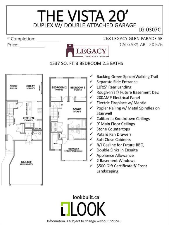 Located in family-friendly Legacy and backing onto a peaceful GREEN SPACE with a WALKING TRAIL, this brand new home is currently under construction with a tentative completion in February 2026. Thoughtful design, upgraded finishes, and future-ready systems come together to create a comfortable and flexible layout ideal for a range of lifestyles. The main level offers 9’ CEILINGS and CALIFORNIA KNOCKDOWN texture for an open, airy feel, while wide windows capture the afternoon and evening light from the SOUTHWEST BACKING YARD. An electric FIREPLACE with a clean-lined mantle anchors the GREAT ROOM, providing warmth and character. In the KITCHEN, STONE COUNTERTOPS, SOFT CLOSE CABINETRY, POTS AND PAN DRAWERS and the full-height tile detail creates a polished backdrop that elevates the hood fan area. The ISLAND includes built-in microwave cabinetry, and a 12” bulkhead above the cabinets adds architectural definition. The adjacent nook provides an inviting space for daily dining with views toward the green space. Upstairs, the primary bedroom features a generous layout, upgraded window design, and a well-appointed ENSUITE for everyday convenience. Two additional BEDROOMS and a BONUS ROOM offer comfortable flexibility for families, guests, or work-from-home arrangements. The upper-level laundry is enhanced by added lighting for improved usability. This home is also equipped with valuable structural and mechanical upgrades, including a 200AMP ELECTRICAL PANEL, rough-in gasline for a future BBQ, and both a SIDE ENTRANCE and extensive ROUGH-INS for FUTURE BASEMENT DEVELOPMENT. These include provisions for laundry, a wet bar, a range hood, dryer vents, and a 2ND FURNACE, allowing future owners to maximize the lower level with ease. Two BASEMENT WINDOWS, including an added 60"x30" slider, support natural light for potential bedroom development. Exterior enhancements elevate both curb appeal and durability, with HARDIE SIDING, upgraded SMARTBOARD TRIMS, a 10’x5’ REAR LANDING with aluminum railing, and stone details carried across key elevations. The DOUBLE ATTACHED GARAGE is finished with layout adjustments suited to the lot design. Window coverings are included, along with an appliance allowance and a $500 landscaping gift certificate for future finishing touches. With its southwest exposure, upgraded finishes, green space backdrop, and future-ready infrastructure, this home in Legacy delivers comfort, style, and long-term flexibility in a growing, well-connected SE community.