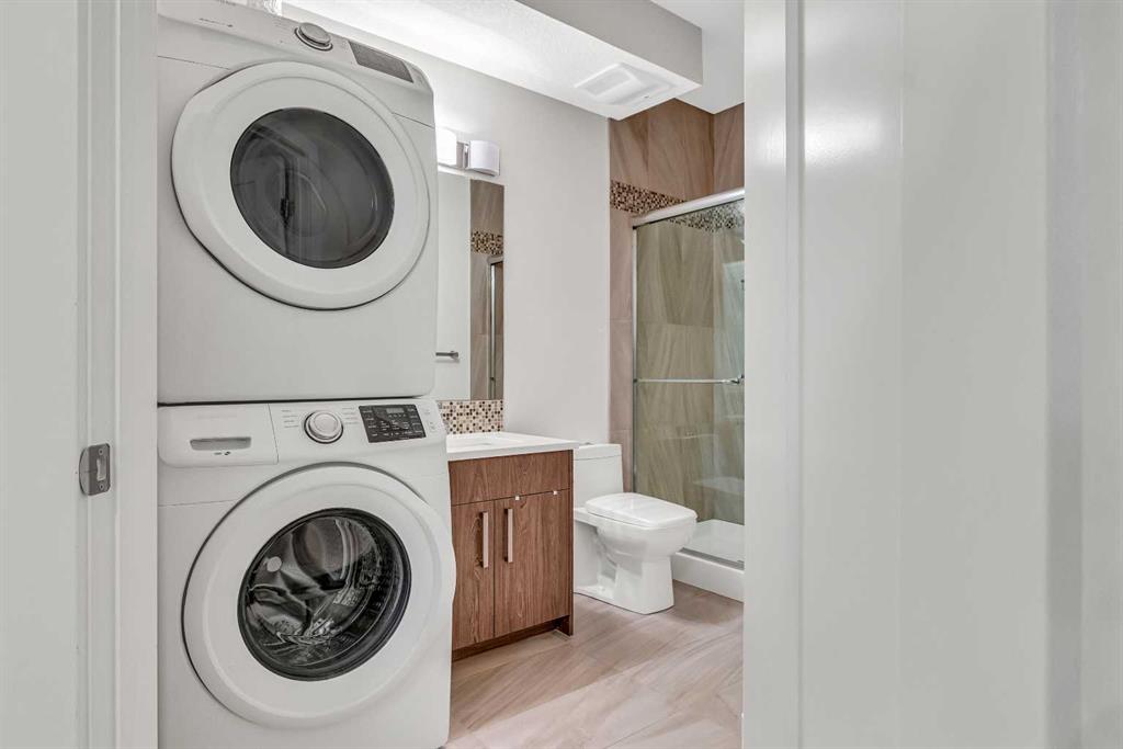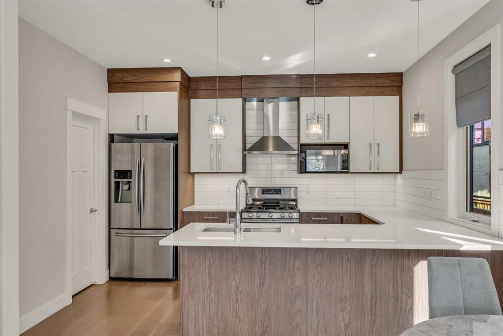 FRONT UNIT with WEST EXPOSURE, CENTRAL AC, and a thoughtful layout designed for comfort and flexibility. NATURAL LIGHT fills the main level where a front living room overlooks the street and a GAS FIREPLACE with floor-to-ceiling tile adds a relaxing focal point. Wide-plank HARDWOOD floors extend into a central dining area with a table and chairs included. The modern kitchen is appointed with QUARTZ COUNTERTOPS, a peninsula island, GAS STOVE, FULL HEIGHT CABINETS, CORNER PANTRY, and stainless steel appliances. A tucked-away powder room completes the main floor. Upstairs, a SKYLIGHT brightens the stairwell and illuminates the upper level. The primary bedroom is spacious with a COFFERED CEILING, WALK-IN CLOSET with BUILT-IN ORGANIZERS, and a LUXURIOUS ENSUITE featuring a DUAL VANITY and STAND-UP SHOWER. A second bedroom includes its own 4PC ENSUITE with skylight, creating a DUAL PRIMARY FLOORPLAN ideal for guests, roommates, or family members. The FINISHED BASEMENT expands the living space with a rec room perfect for movie or game nights, a THIRD BEDROOM that offers flexibility for guests, a teenager’s retreat, or a quiet home office, a 3PC BATH with a sleek stand-up shower for modern convenience, and a thoughtfully placed laundry area with washer/dryer included for everyday practicality. Outside, a PRIVATE FRONT COURTYARD creates ample outdoor space to barbeque and unwind, complemented by low-maintenance landscaping. A SINGLE GARAGE provides secure parking and storage. Situated in the established neighborhood of KILLARNEY/GLENGARRY, this home balances quiet residential streets with urban convenience. Westbrook LRT, Killarney Aquatic Centre, and numerous local parks are nearby along with schools, coffee shops, and restaurants on 17th Avenue. Quick access to downtown and major routes ensures effortless connectivity. This thoughtfully designed residence combines style, comfort, and a walkable location for a lifestyle that feels both connected and at ease.